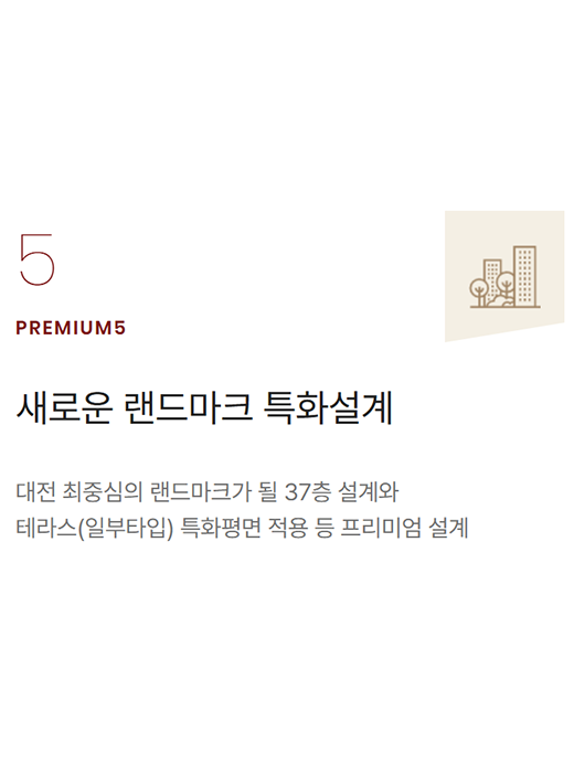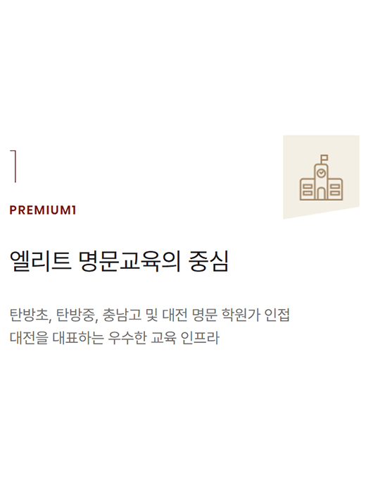 PREMIUM 01 엘리트 명문교육의 중심 탄방초, 탄방중, 충남고 및 대전 명문 학원가 인접 대전을 대표하는 우수한 교육인프라 더보기 PREMIUM 02 역세권 멀티 교통망 바로 앞 탄방역과 가까운 시청역, 2호선 트램(예정), 경부고속도로, 천변도시고속화도로 등 교통환경 더보기 PREMIUM 03 편리한 둔산생활권 인프라 갤러리아백화점, 롯데백화점, 이마트, 영화관, 보라매공원, 대전 예술의전당 등 중심생활 더보기 PREMIUM 04 대전 행정타운 프리미엄 대전시청, 서구청, 정부대전청사, 법원 등 살기좋은 주거환경을 선사하는 행정의 중심지 더보기 PREMIUM 05 새로운 랜드마크 특화설계 대전 최중심지의 랜드마크가 될 37층 설계와 테라스(일부타입) 특화평면 적용 등 프리미엄 설계 더보기 PREMIUM 06 힐스테이트 브랜드 프리미엄 브랜드 평판 1위, 베스트 아파트 브랜드 1위 힐스테이트만의 특별한 브랜드 가치 더보기 PREMIUM 01 엘리트 명문교육의 중심 탄방초, 탄방중, 충남고 및 대전 명문 학원가 인접 대전을 대표하는 우수한 교육인프라 PREMIUM 02 역세권 멀티 교통망 바로 앞 탄방역과 가까운 시청역, 2호선 트램(예정), 경부고속도로, 천변도시고속화도로 등 교통환경 PREMIUM 03 편리한 둔산생활권 인프라 갤러리아백화점, 롯데백화점, 이마트, 영화관, 보라매공원, 대전 예술의전당 등 중심생활 PREMIUM 04 대전 행정타운 프리미엄 대전시청, 서구청, 정부대전청사, 법원 등 살기좋은 주거환경을 선사하는 행정의 중심지 PREMIUM 05 새로운 랜드마크 특화설계 대전 최중심지의 랜드마크가 될 37층 설계와 테라스(일부타입) 특화평면 적용 등 프리미엄 설계 PREMIUM 06 힐스테이트 브랜드 프리미엄 브랜드 평판 1위, 베스트 아파트 브랜드 1위 힐스테이트만의 특별한 브랜드 가치